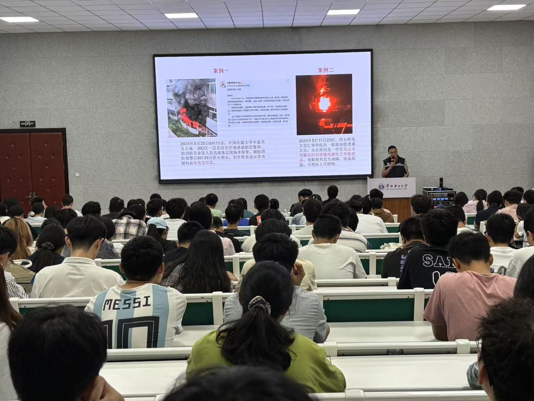 培训中,保卫处消防科蔡老师紧扣高校生活实际,首先通过分析高校火灾常见的区域分布与主要原因类型,结合近年来国内高校发生的典型火灾案例,以案说法,深入浅出地剖析了事故背后的成因与教训。在此基础上,培训重点聚焦学生宿舍,系统梳理了宿舍内可能存在的各类安全隐患,如违规使用电器、乱拉乱接电线、存放易燃物品、堵塞疏散通道等,并针对性地给出了具体的安全提示与防范要求。