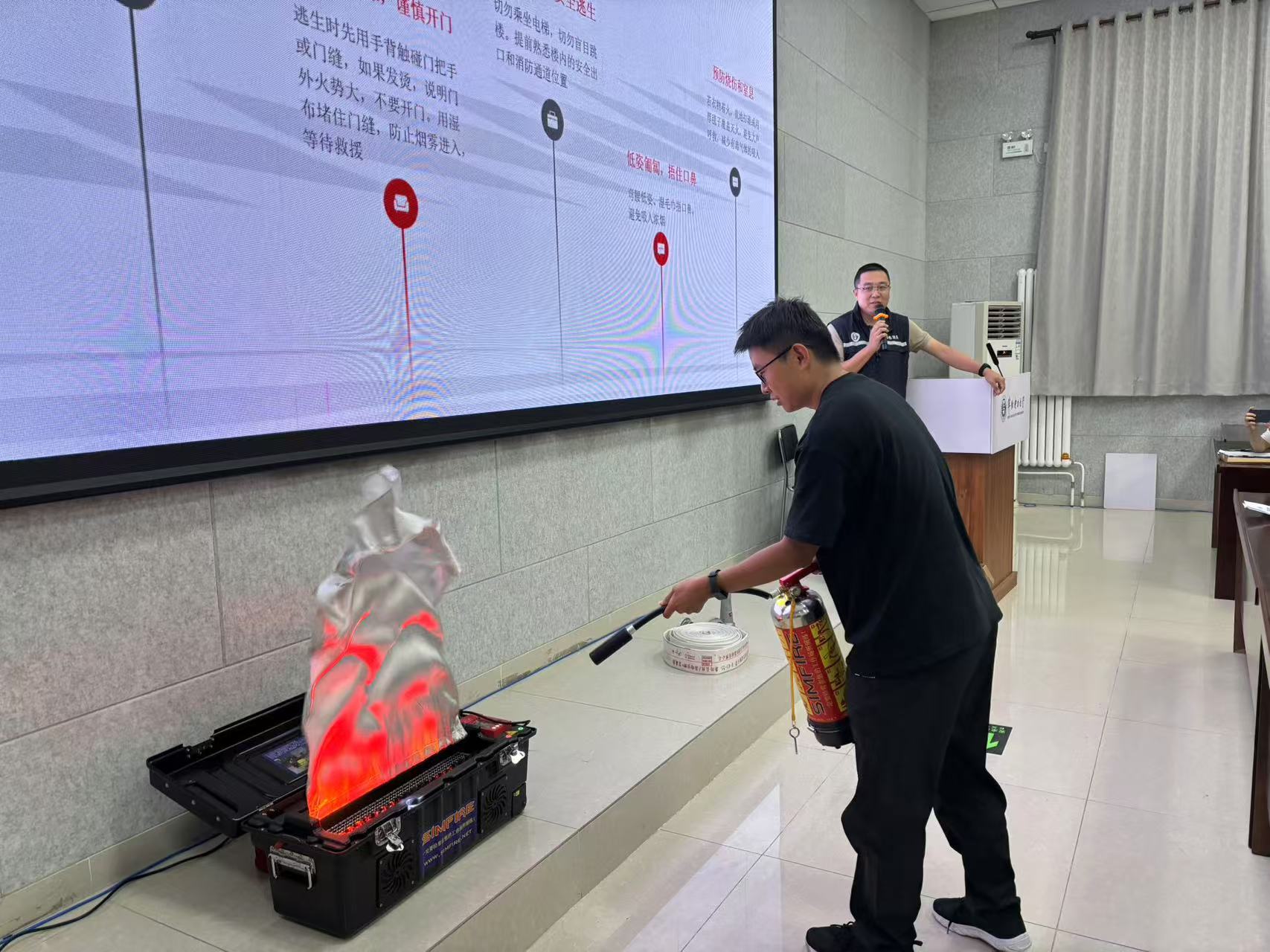 理论讲解结束后,培训进入实操演练环节。在现场工作人员的指导下,同学们踊跃上前,亲自操作模拟灭火器,沉浸式体验灭火全过程。这一环节将“提、拔、握、压”的四字操作口诀从理论转化为肌肉记忆,极大地提升了同学们的实战技能。